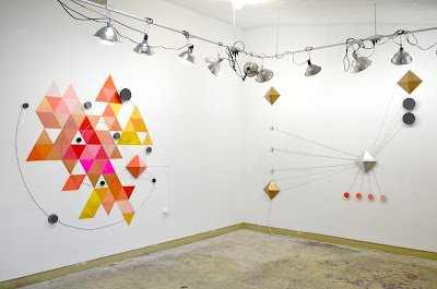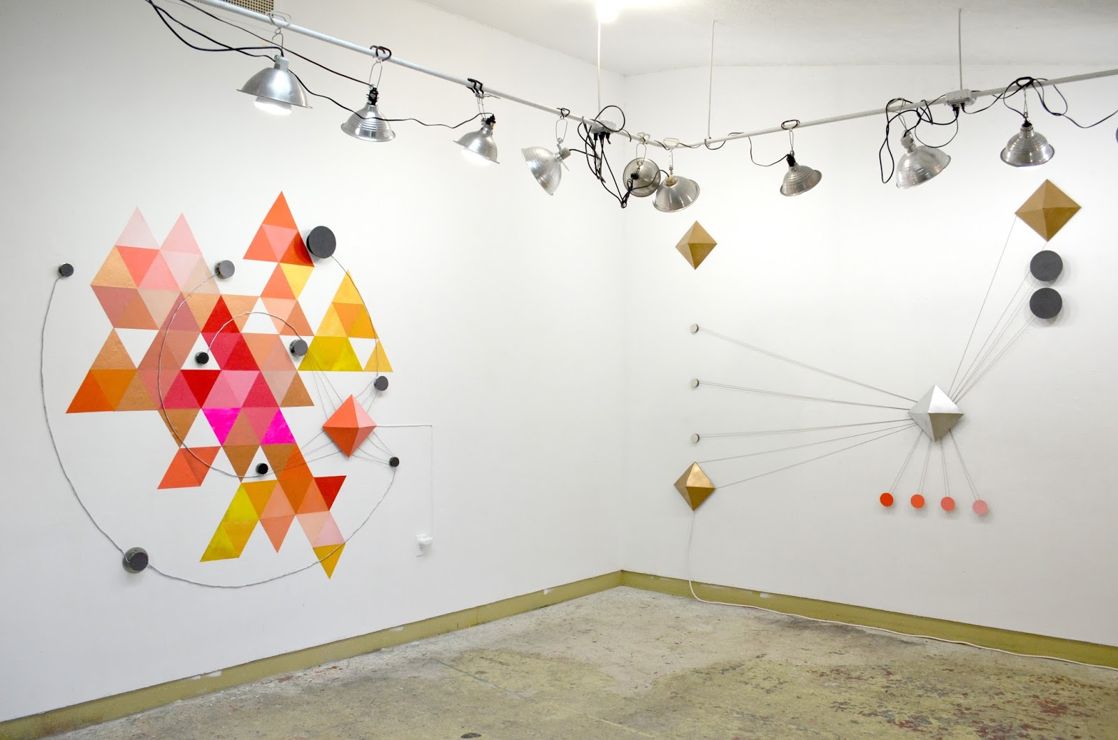 Mary executed the artwork directly onto the wall with the mechanical elements incorporated into the pieces. In one, wire provides a spiral that counterbalances the colored triangles, in the other, straight lines radiate from a 3-D pyramid to the brightly hued round speakers. The pyramids cleverly conceal circuit boards, which generated the sounds.