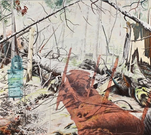 Prilla approaches landscape conceptually employing fragmentation and the insertion of random objects that resonate with meaning to amplify the work’s effect.